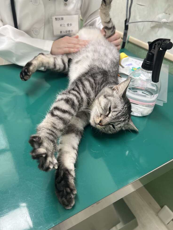 病院の診察台でも、のびーっとしたり、先生に診てもらってご機嫌です。
