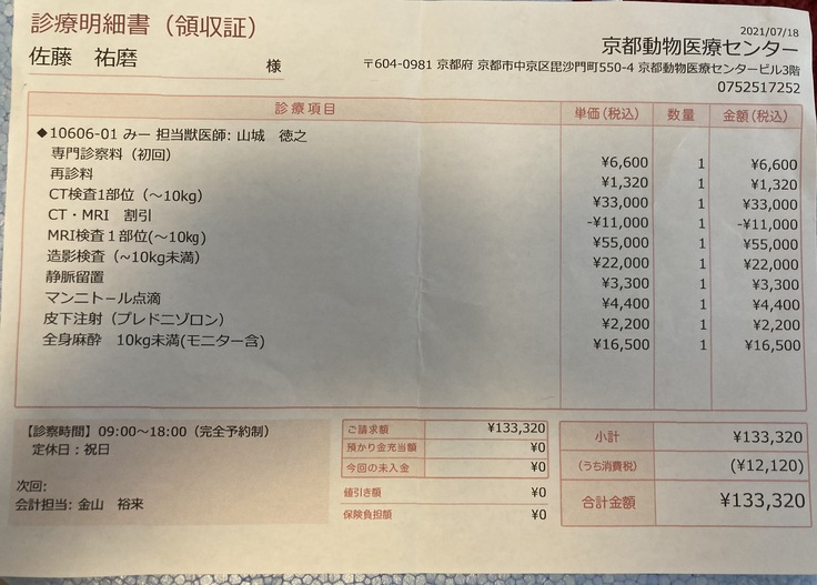 みーちゃんの治療費、主に点滴、ステロイド注射、血液検査、抗がん剤