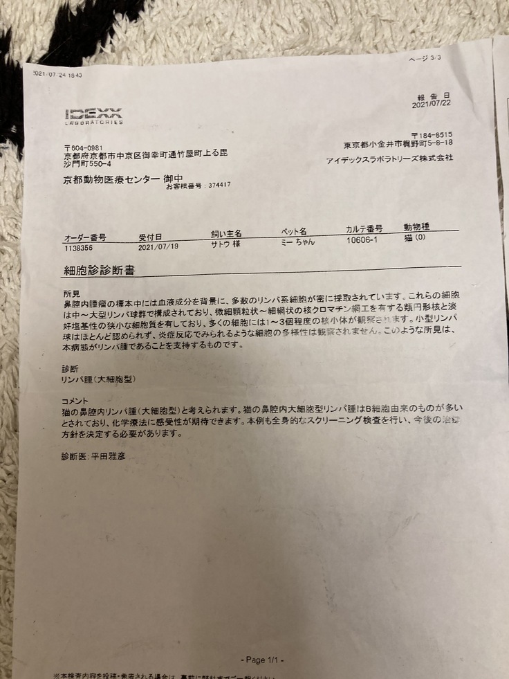 画像診断結果は左の目の後ろから鼻にかけて大きな腫瘍があり、それが原因で脳のヘルニアもあり、かなり悪い状態と言われ、小脳が頭蓋骨から出そうになっており、出てしまったら呼吸停止、即死の状態ですと画像診断の先生に言われました。