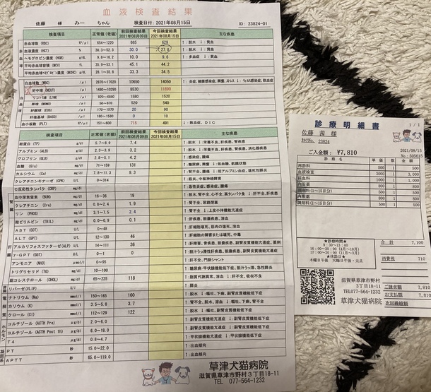 みーちゃんの4回目の抗がん剤を投与する前の血液検査をしました。