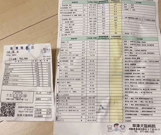 超音波検査(エコー)、注射代、薬代は合計に含みません。