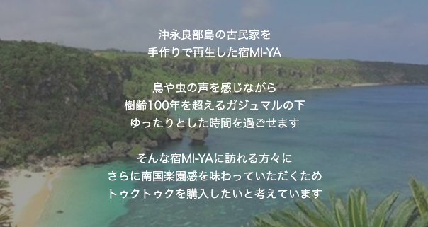 今回のチャレンジでは、古民家宿をご利用いただく方に、もっと南国楽園感を味わっていただくために、トゥクトゥクを購入したいと考えています。