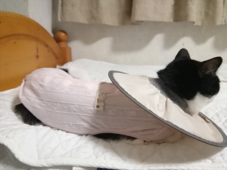 化膿止めを塗布したカット綿を貼り、久しぶりにお洋服を着たマイケルです。
