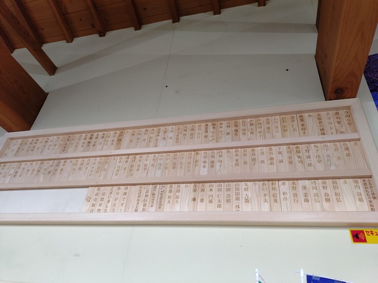 先日、ご支援へのリターンとして、「施設にお名前を掲出」をお選びいただいた皆様のお名前を、道の駅三岳の店内に設置した掲示板に掲出させていただきました。