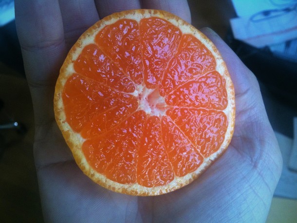 まだ「ぶさいくミカン」と名付けられる前のミカンです。(と私の手です)