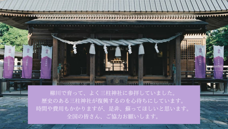 本日23時までとなった本取り組みなのですが、この三柱神社の100年後の未来へ向けた取り組みを知っていただきたく、どうかシェアのご協力をいただけないでしょうか。