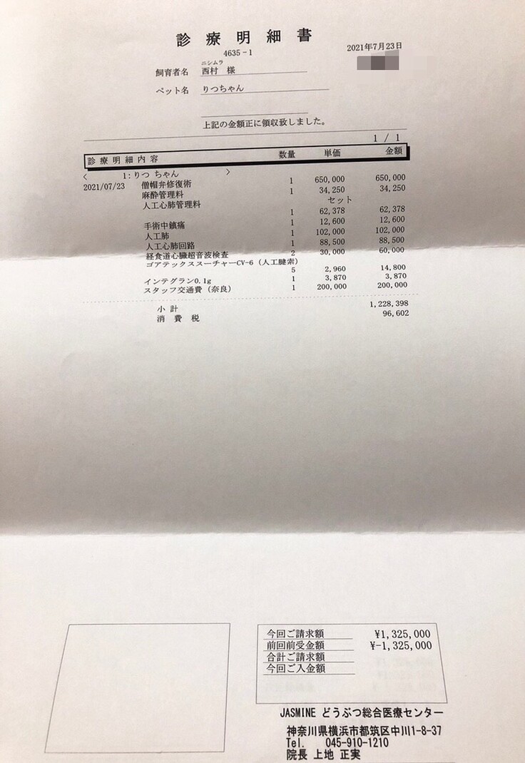 ※入院費(¥440.000)は頭金の分を引いた金額となっております。
