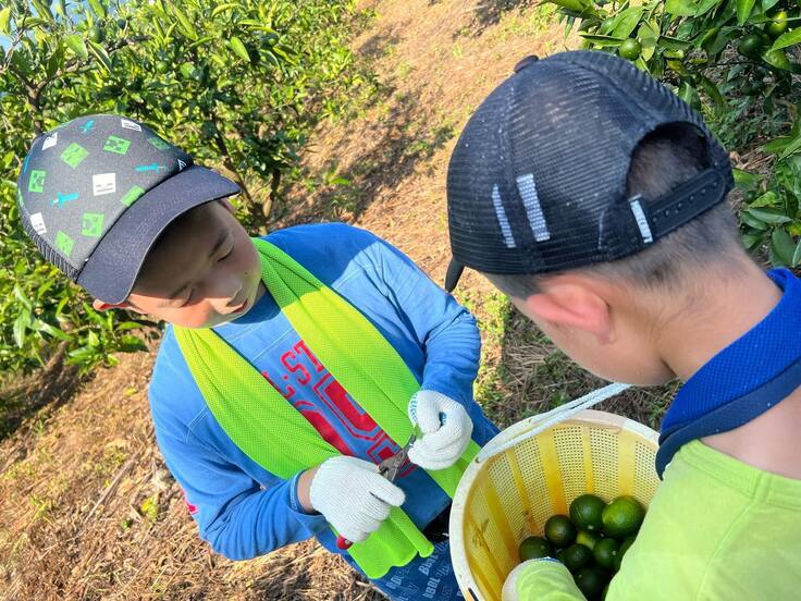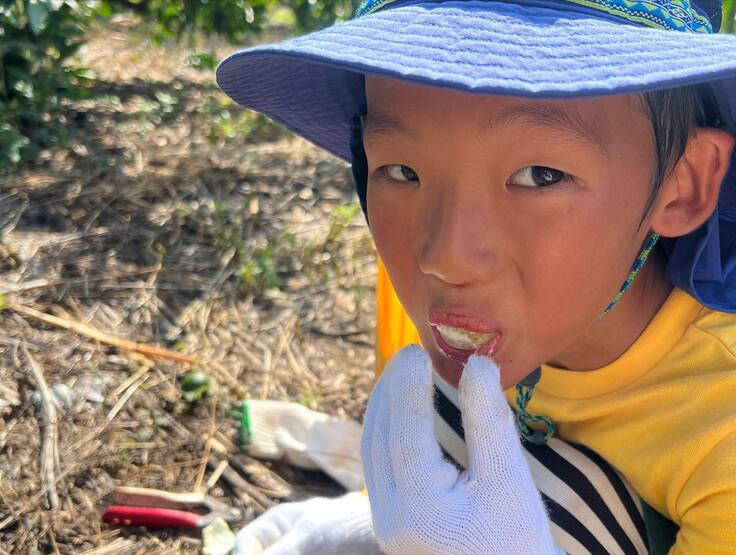 そして、この度地元の方から耕作放棄される寸前の畑を借り受けましたので、今まで細々と収穫していた青みかんですが、夏休み企画として呼びかけたところ沢山の子ども達が間引き作業の手伝いに来てくれました♪
