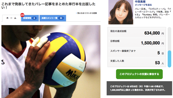 皆様、シェア拡散&ご支援ありがとうございます。おかげさまで、「バレー記事作品集眠らずに走れ」ご支援額が677,000 円(達成率45%)になりました。