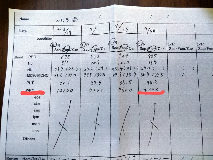 白血球が少し低くなっていますが、今までが高かったのと、3000〜3500という猫ちゃんはざらにいるから、心配するレベルではないとのこと。(べるは今回4000)