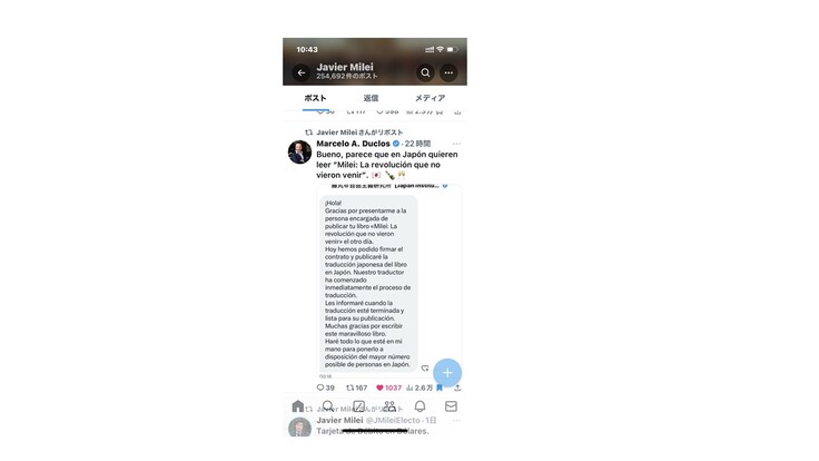 また、私は本の著者であるMarcelo A. DuclosとNicolás Márquezに定期的な連絡をとっており、出版社と翻訳出版の契約が締結できたときは、著者のMarceloが喜んでXでも報告してくれています。ミレイ大統領もそれをリツイートしてくれました。