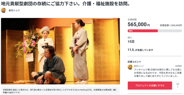 さて、このプロジェクトも残すところ15日となりますが、今後も劇団ミムラとして地域のお役に立っていくためにも今回の挑戦を必ず成功させられるよう、最後まで頑張ってまいります!