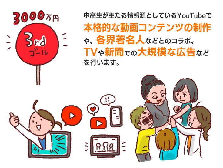 アンケート調査を踏まえ、中高生が主たる情報源としているYouTubeで本格的な動画コンテンツの制作や、各界著名人などとのコラボ、TVや新聞での大規模な広告などを行います。