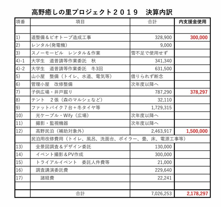2)冬に行う高野の雪まつりを中心にした、冬の道の整備費用 に残り金額