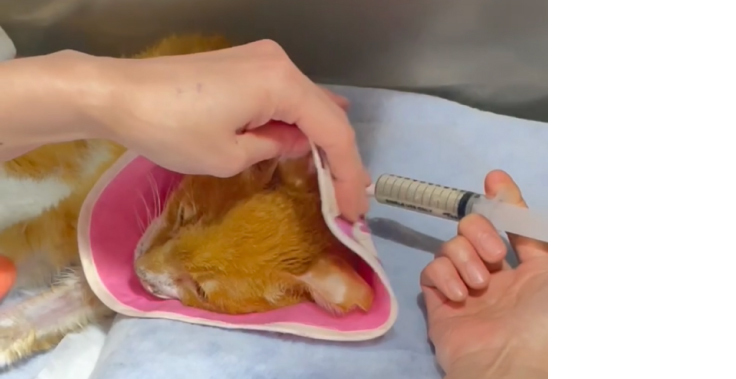食欲が落ちているため、施設の入院室にて静脈点滴と鼻カテーテルによる栄養補給を行っています。