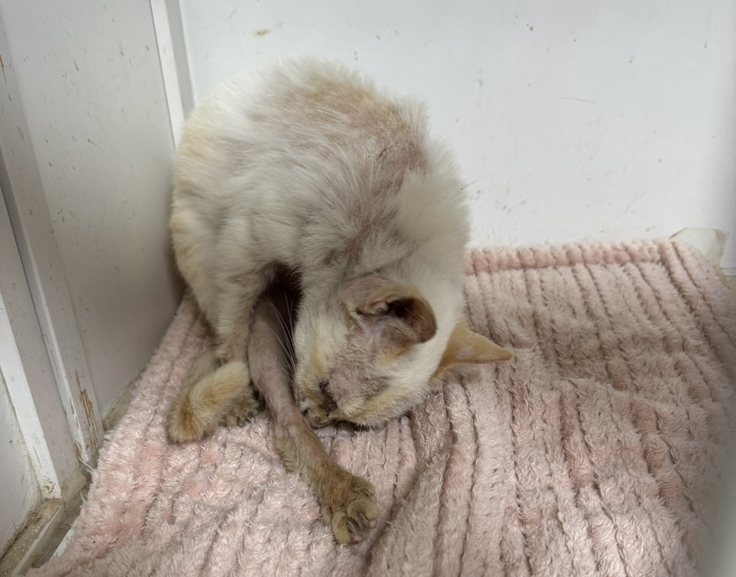 私たちが、チームZEROシェルターに駆け付けた時は、ケージに隔離され、全身の毛が薄くなり、皮膚も赤く、真菌も発症していました。真菌は恐らく、強いアレルギー症状の治療で免疫力が低下したためだと推測されます。往診の獣医師さんにもすぐに診てもらいました。