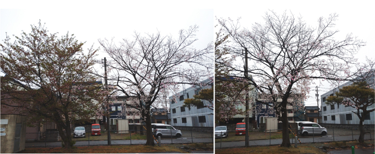 皆さん、こんにちは!湊小学校校舎の南東側にある駐車場に2本の桜の木が植えられています。校舎から見て手前の桜は福井市の平均的時期に満開を迎えますが、校舎から見て向こう側の桜はさらに1週間から10日間ほど遅れて満開を迎えます。