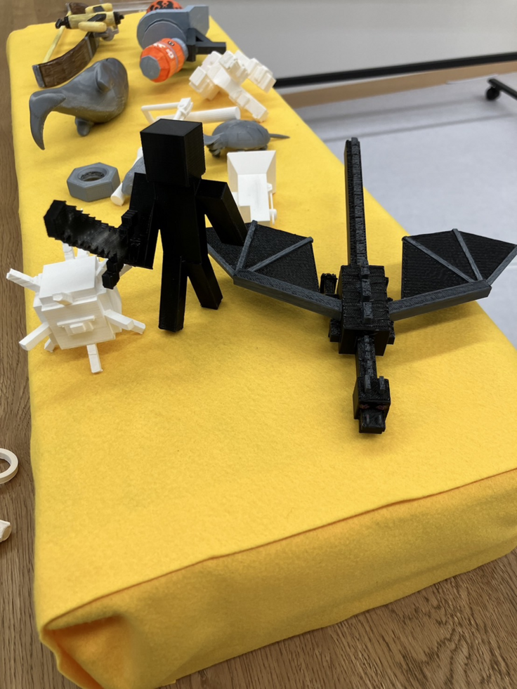 3DモデリングツールでデザインしたMinecraftのキャラクターを3Dプリンターで出力したフィギュアを見せてくれる子。