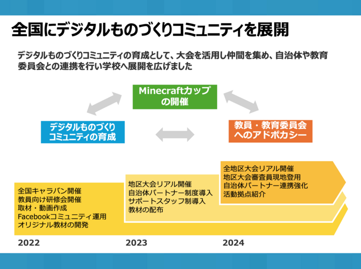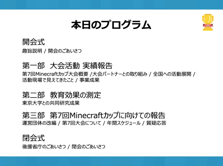 大会は今後も続いていきますが、Minecraftカップがこれまで取り組んできた成果報告と、助成いただいた3年間の実施報告をかねて、本報告会の開催となりました。