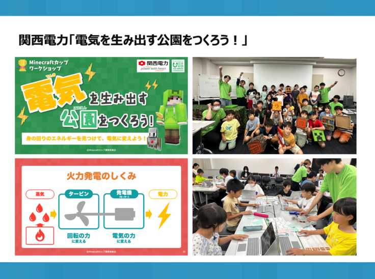 Minecraftカップでは、大会パートナーの企業のみなさんと連携して、教育版マインクラフトを使ったオリジナル教材を制作し、その教材を元にワークショップの企画・運営も行っています。