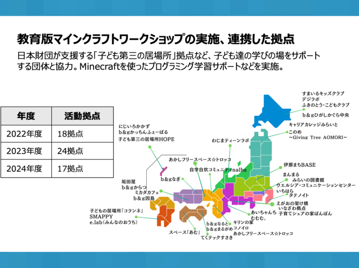 さらに、ワークショップをサポートいただいた方には、各地域や拠点施設でデジタルものづくり教育を展開できるように、教材や教育版マインクラフトのワールドを配布しています。