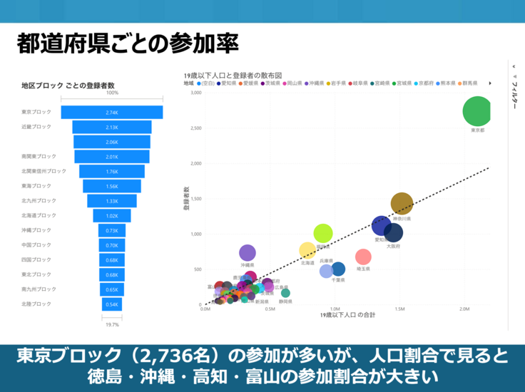 都道府県ごとの参加率を人口割合で見ると、徳島・沖縄・高知・富山の参加割合が多いことがわかります。