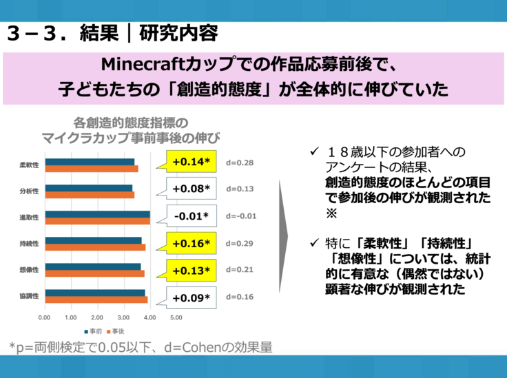 調査の結果、マイクラカップに参加することで子どもたちの創造的態度が全体的に伸びており、特に元々「自分は創造性があまりないな」「自分は課題を見つけて解決する能力が低いな」と自認しているお子さんたちの伸び率が顕著に!