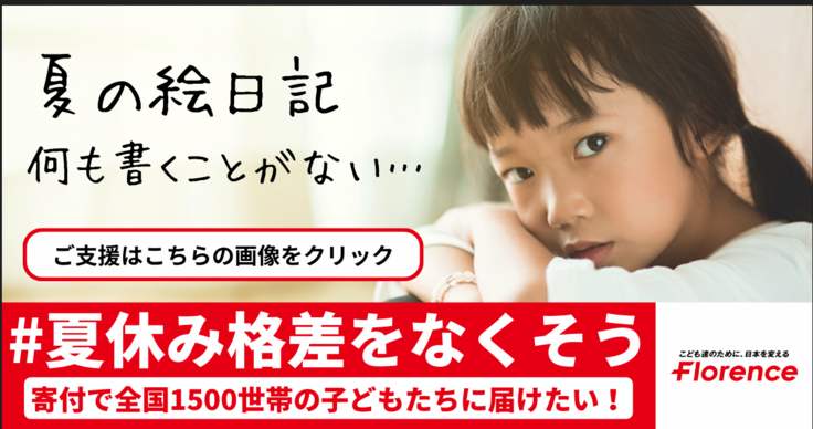 そこでフローレンスは、7月12日より「#夏休み格差をなくそう プロジェクト」を開始しました。本プロジェクトでは、家庭の状況に関わらず、すべての子ども達が夏休みの体験を楽しみ、大切な思い出が作れる社会を届けるために、賛同してくださる企業と連携し、ご寄付を原資に、全国の1500世帯以上の子どもたちに夏の思い出をプレゼントすることを目指します。