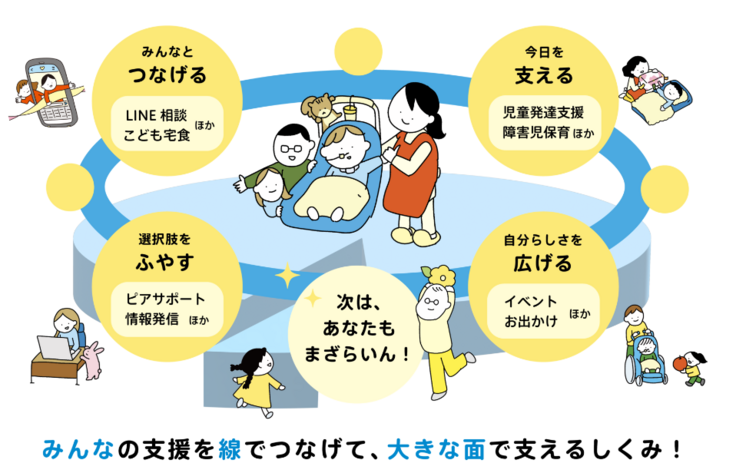 ①「身近に相談できる人がいない」を解決! SNSを活用したデジタル相談支援:「医ケア児おやこよりそいチャット」 ②「きょうだい児との時間も大切にしたい」の気持ちに寄り添う。「医ケア児おやこ給食便」 ③「家族みんなで出かけたい」を叶える!「医ケア児おやこ映画会」 |