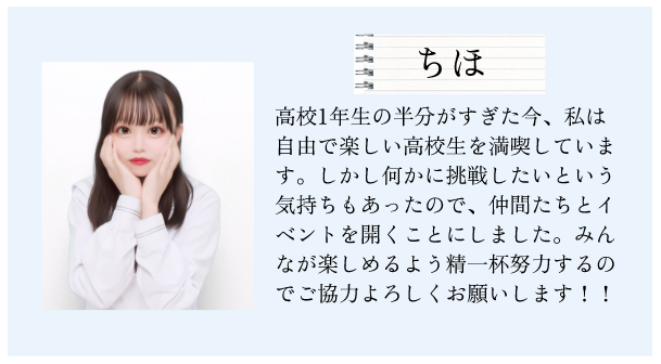 また、実行委員は私達だけではありません。インスタをフォローしてくださった方、クラウドファンディングに参加してくださった方、イベントにきてくださる方全員がみんなJK文化祭を作り上げるうえで欠けてはならない実行委員です。