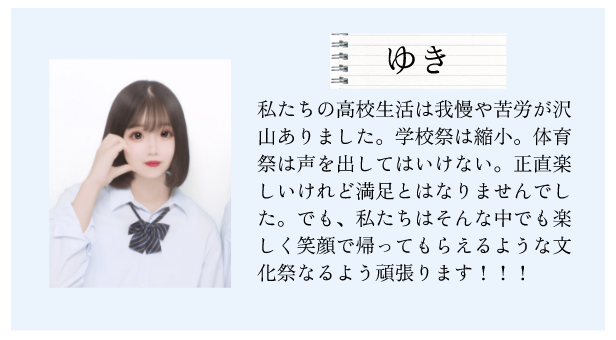 学校生活に悔いが残ってしまった人、日常がつまらなくかんじる人、コロナ禍に疲れた大人の方、小さい頃からコロナ禍だったこれから学生になる子、私達のような思いを持った学生の皆さん