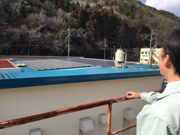 工場の屋根に取り付けられたパネルを、展望台のようなベストボジションから眺めるのは、丹波乳業の吉田社長です。