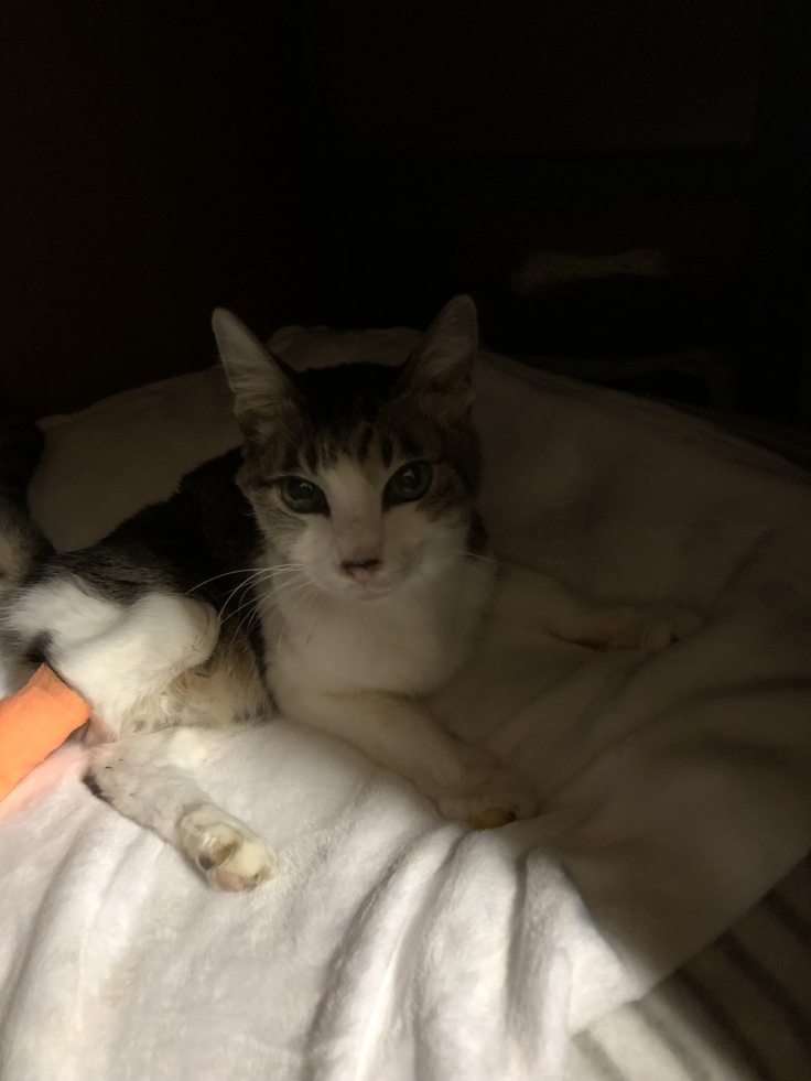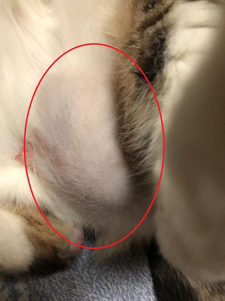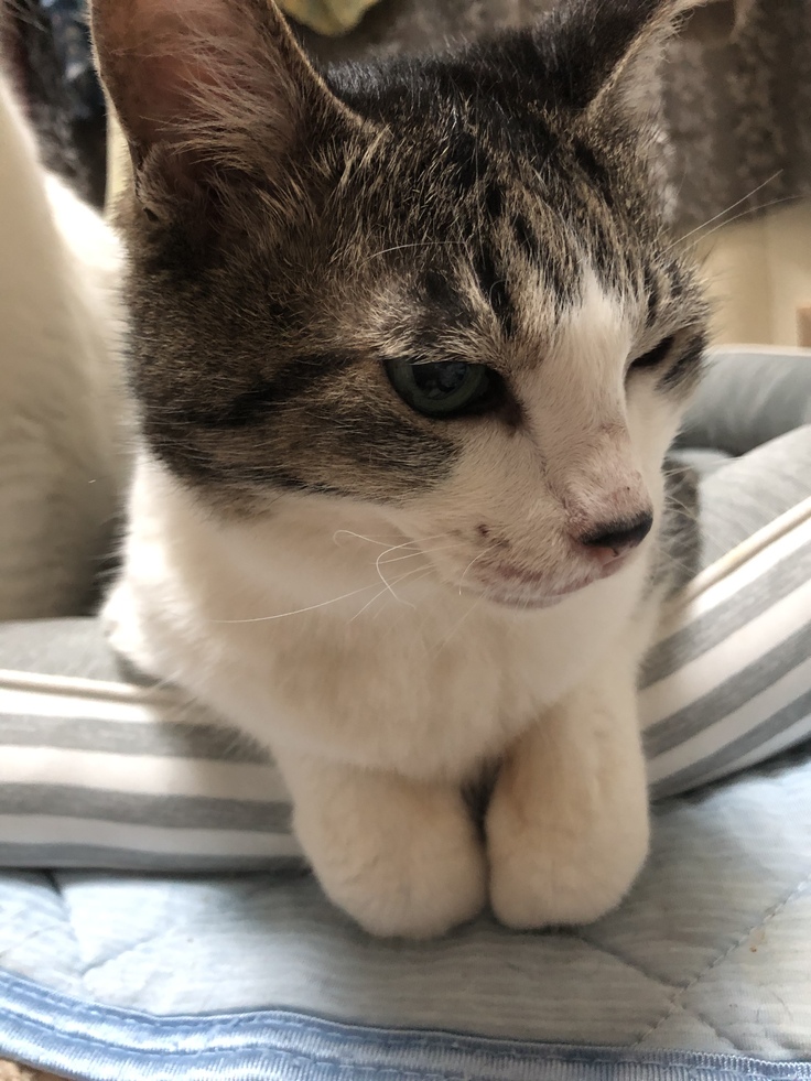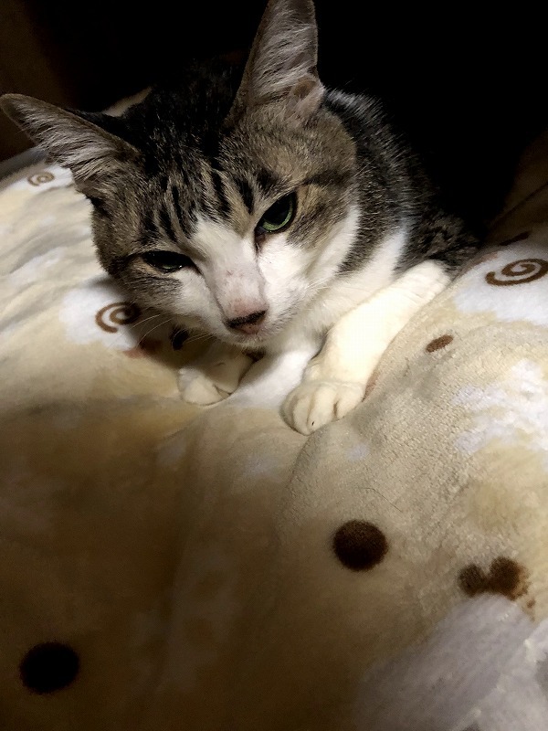 シーツに脚の傷の血が付着し本当に痛々しいですが、ここがお気に入りなので、ここで優しくブラッシングをしたり撫で撫でしたりしています。