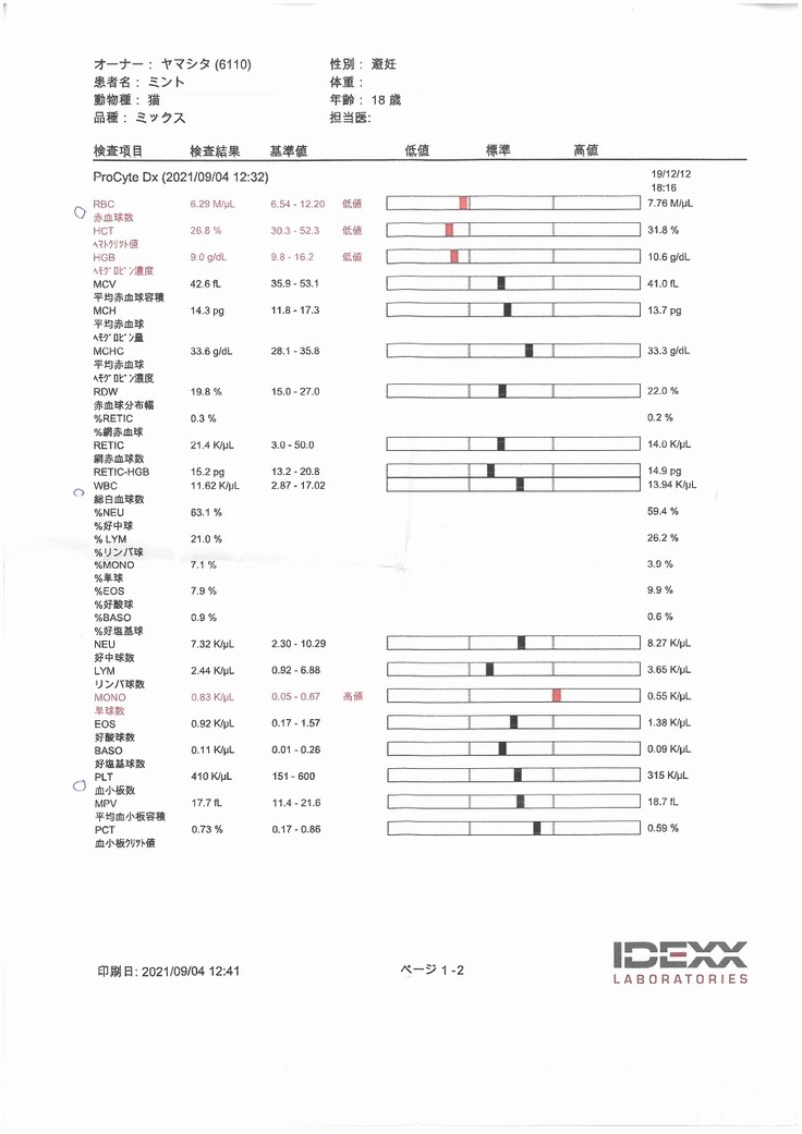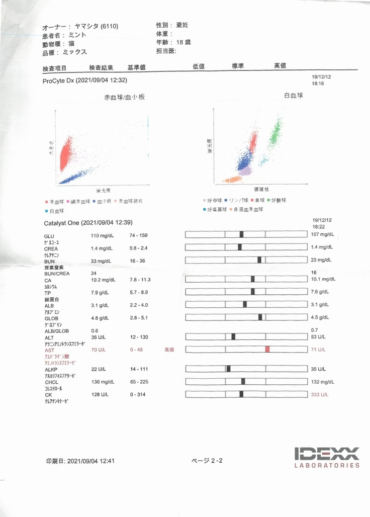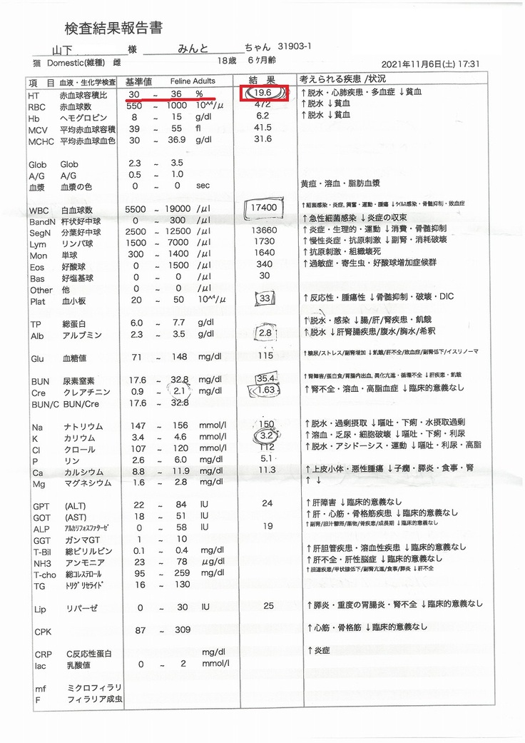 また、先日の血液検査の結果で腎数値が少し悪くてもそんなに深刻に考えていなかったのですが、猫の血液検査に腎臓の異常値が出ている時点で腎臓がかなり悪いとのお話をいただきました。