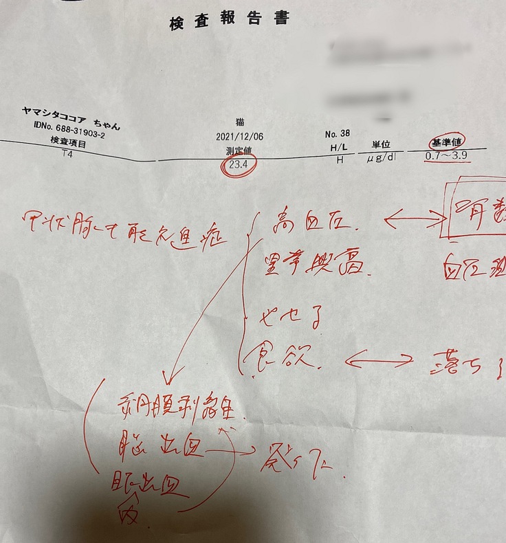 前回の診察時に、仮に甲状腺機能亢進症だった場合、積極的な投薬治療はココアに負担がかかるため、お勧めはできないと先生に言われました。