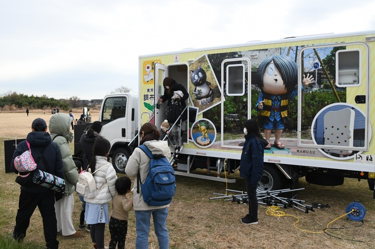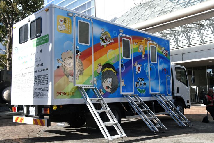 皆さまから御支援いただいた資金をもとに整備した,ゲゲゲの鬼太郎ラッピングの防災用トイレカーが納車されました。