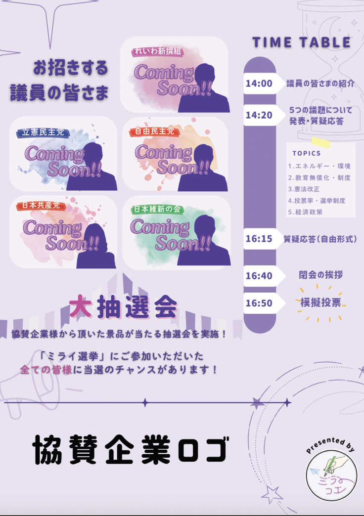 大まかな議題と、参加政党、そして大抽選会と協賛企業ロゴを掲載させていただいております。