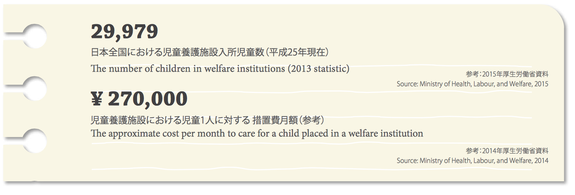 現在日本では、約600ヶ所の児童養護施設に3万人近くの子どもたちが暮らしています。1舎に20人以上で暮らす大規模な施設がいまだに約半数を占めており、養子縁組や里親制度で家庭的な養護を受けられる可能性はごくわずかです。また、施設に入所する理由で最も多いものは虐待です。入所前に親から虐待された経験がある子どもは、約6割にも上るとされています。