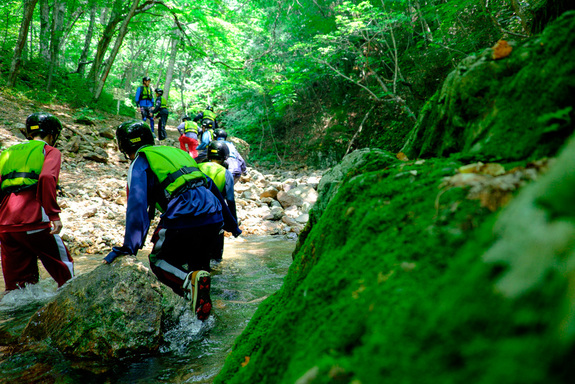 Lizards and frogs sun themselves on rocks as intrepid campers forge their way right up to the middle of the stream. It can be hard going , but the children don't give up. They shout encouragement to those at the back of the pack, and join hands to help each other over difficult boulders and slippery sections.
