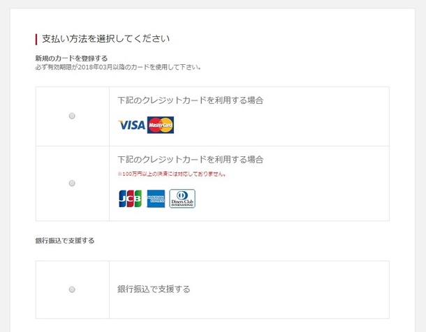 ②次に、支払い方法選択画面が出ますので、ご希望の方法を選択してください。「クレジットカード」と「銀行振込み」の二種類があります。