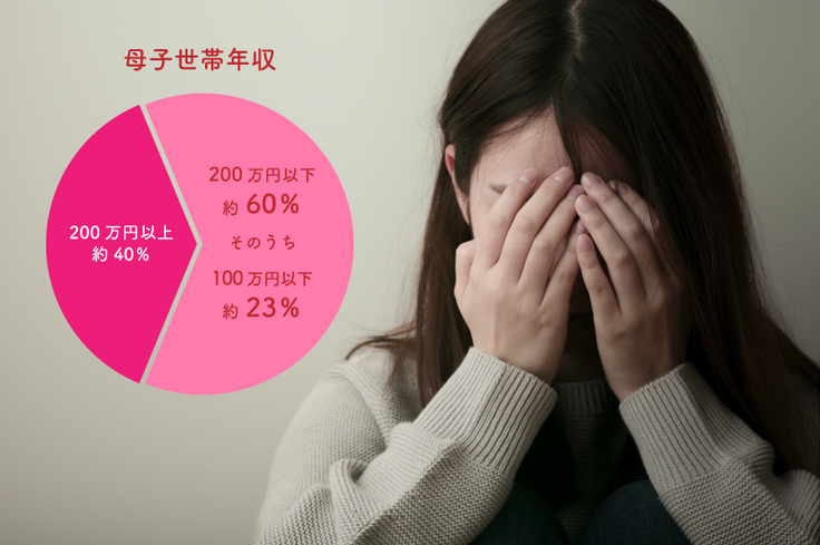 両親家庭、父子家庭と比べ、得られる年収が低い母子世帯*²は、年収200万円以下が約60%、そのうち約23%が100万円以下で過ごしています。*²厚生労働省(平成28年度全国ひとり親世帯等調査結果報告)