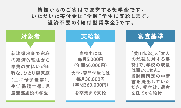 新潟県出身で家庭の経済的理由から学費の支払いが困難な、ひとり親家庭(主に母子世帯)、生活保護世帯、児童養護施設の学生