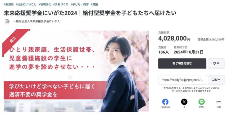 また、現状では新潟県内の学生を支援していますが、将来的には全国の子どもたちにも支援を広げたいと考えています。クラウドファンディングを通じて、新潟の子どもたち、ひいては全国の子どもたちが安心して学べる仕組みを、皆さまと共に築いていきたいと願っています。