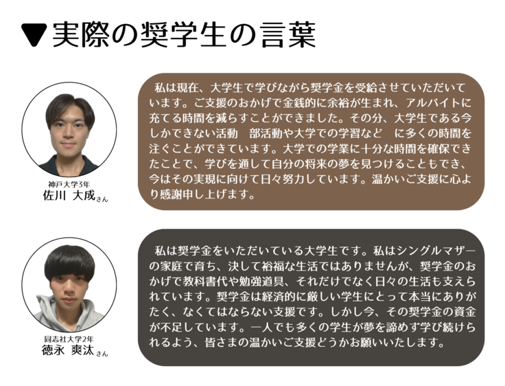 さらに今回の挑戦では、実際に奨学金を受け取った二人の学生から、顔出しでメッセージを寄せてもらいました。学生たちの言葉の奥にある想いを、ぜひ感じてください。