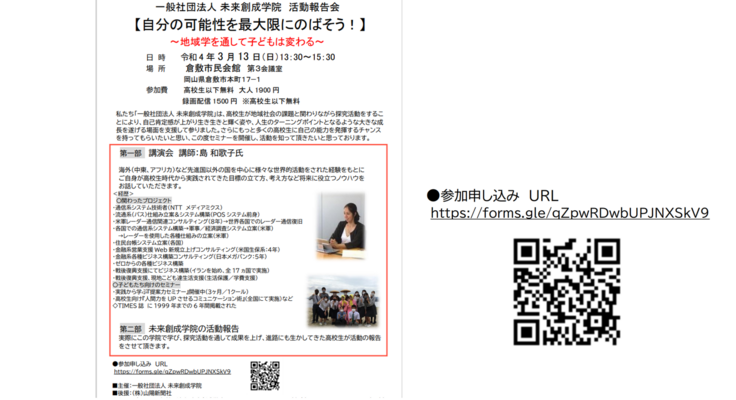 今年度の未来創成学院のセミナーでは、島和歌子先生を講師にお迎えし「脳の使い方、時間の使い方、目標の立て方など」実践的なお話をしていただき、合わせて高校生の活動報告もします。