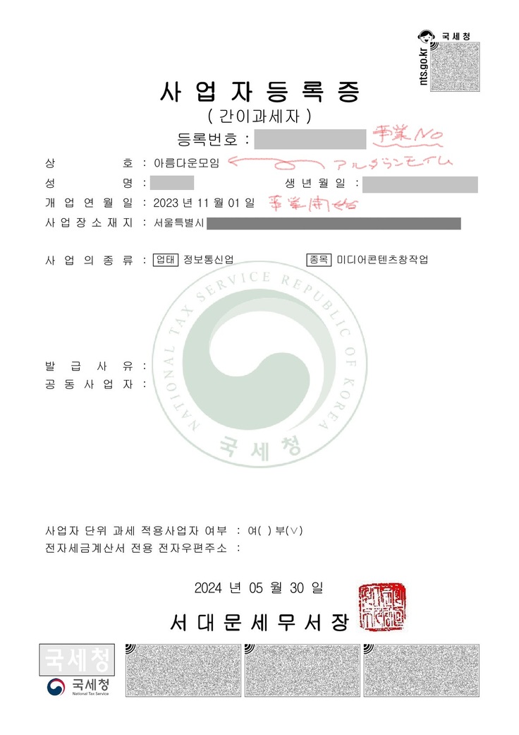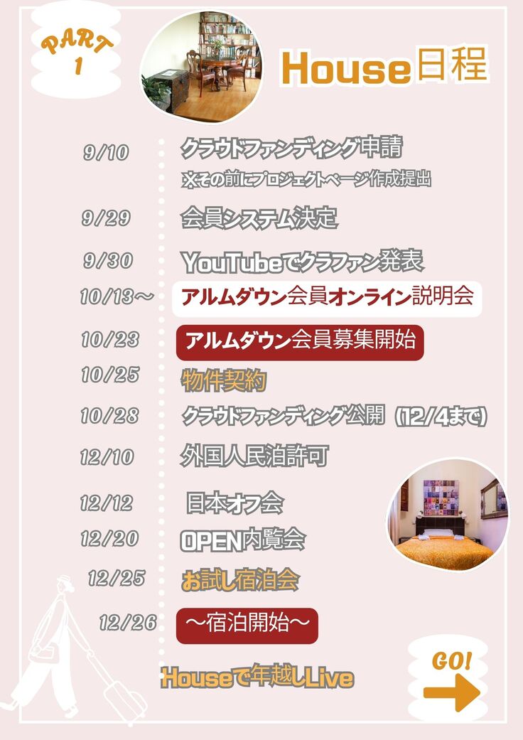 - ハウスの契約が終わり次第(10月中を予定)、内装・家具搬入、消化器などすべて設置したのちに12月初旬に外国人民泊事業の申請を提出します。 現在も韓国民泊協会の研修を受講し担当の方と相談を進めています。