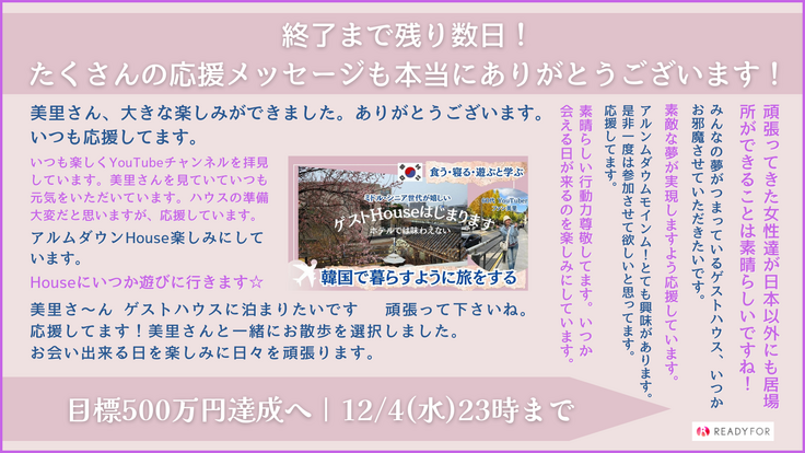 皆さまのあたたかいコメントに励まされる毎日です。残り約1週間、最後まで呼びかけを続けさせていただきますので、ご支援、応援、拡散にご協力いただけるととっても嬉しいです!よろしくお願いいたします!