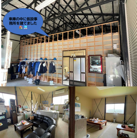 車庫内に作った仮設事務所・・・事務員さんの仕事場と、社員の休憩所です。