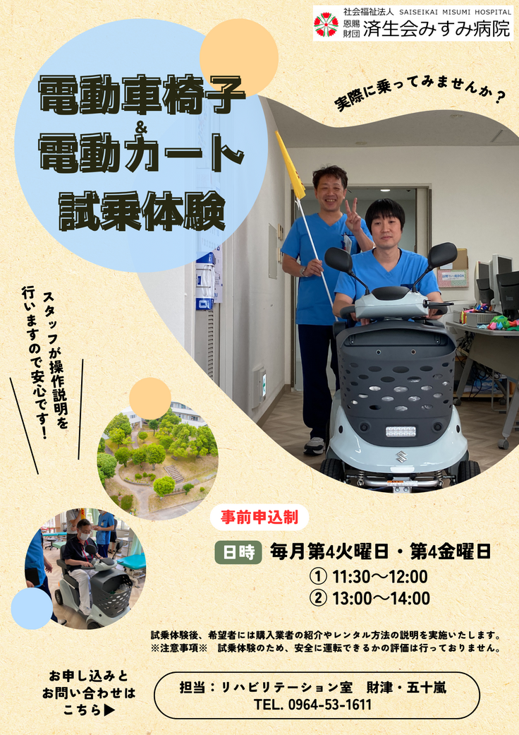 電動車いすと電動シニアカーの導入後、入院患者さんや通所リハビリテーションで当院にいらっしゃる方を中心に試乗をご案内していましたが、今後は地域の方にも試乗していただくため定期的な試乗日を設けることになりました。