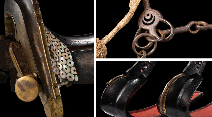 またもう一つの国宝『円文螺鈿鏡鞍』は、一具一揃い(鞍、鐙、轡、面懸、胸懸、鞦から成る馬具一式)が完全に遺存しており、鎌倉時代の軍陣用の鞍としては唯一の遺例です。